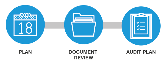 The evaluation includes interviews, process observation, document review, physical inspections, and system review to determine compliance with the standard and with the organization’s defined controls.